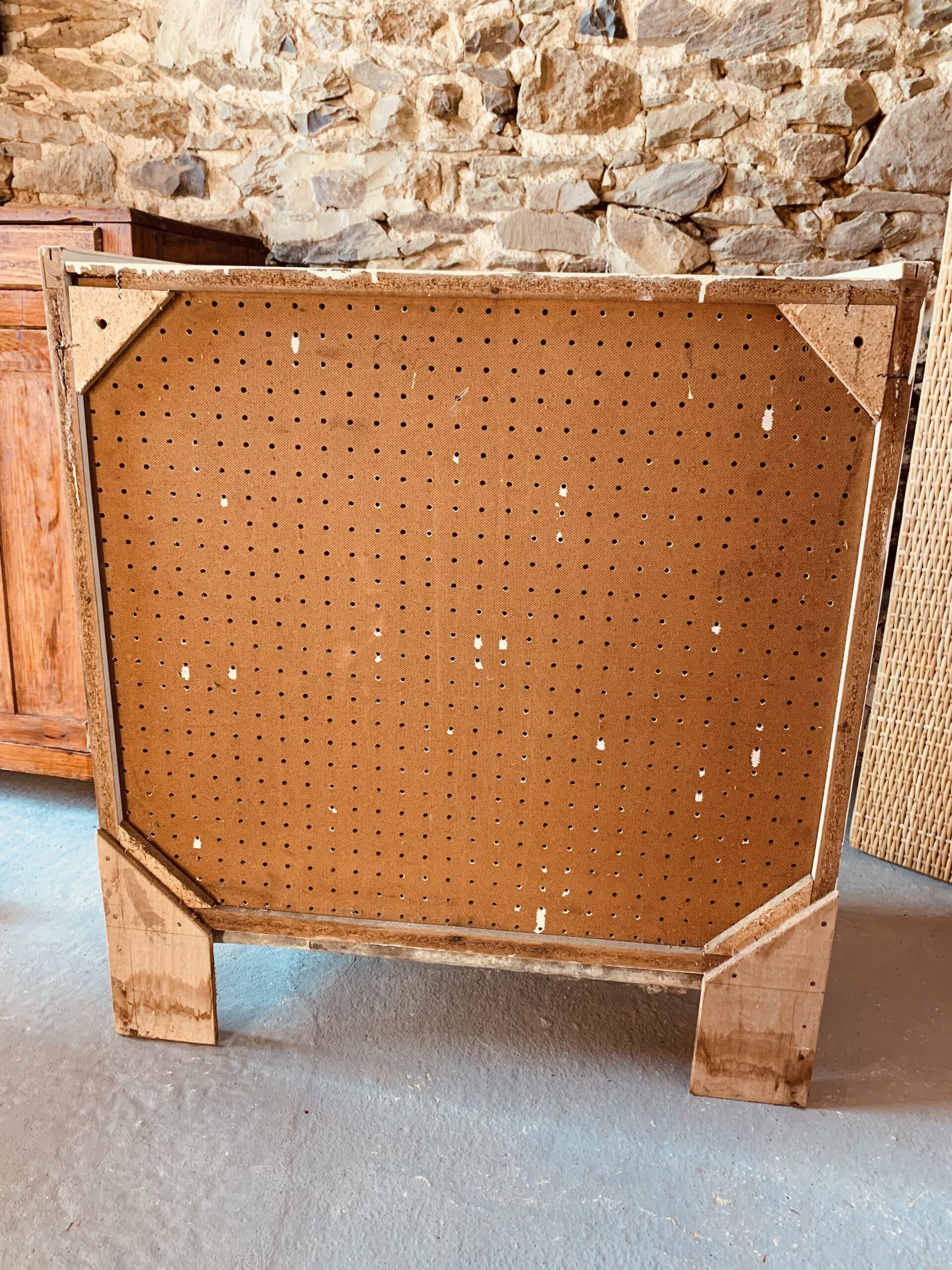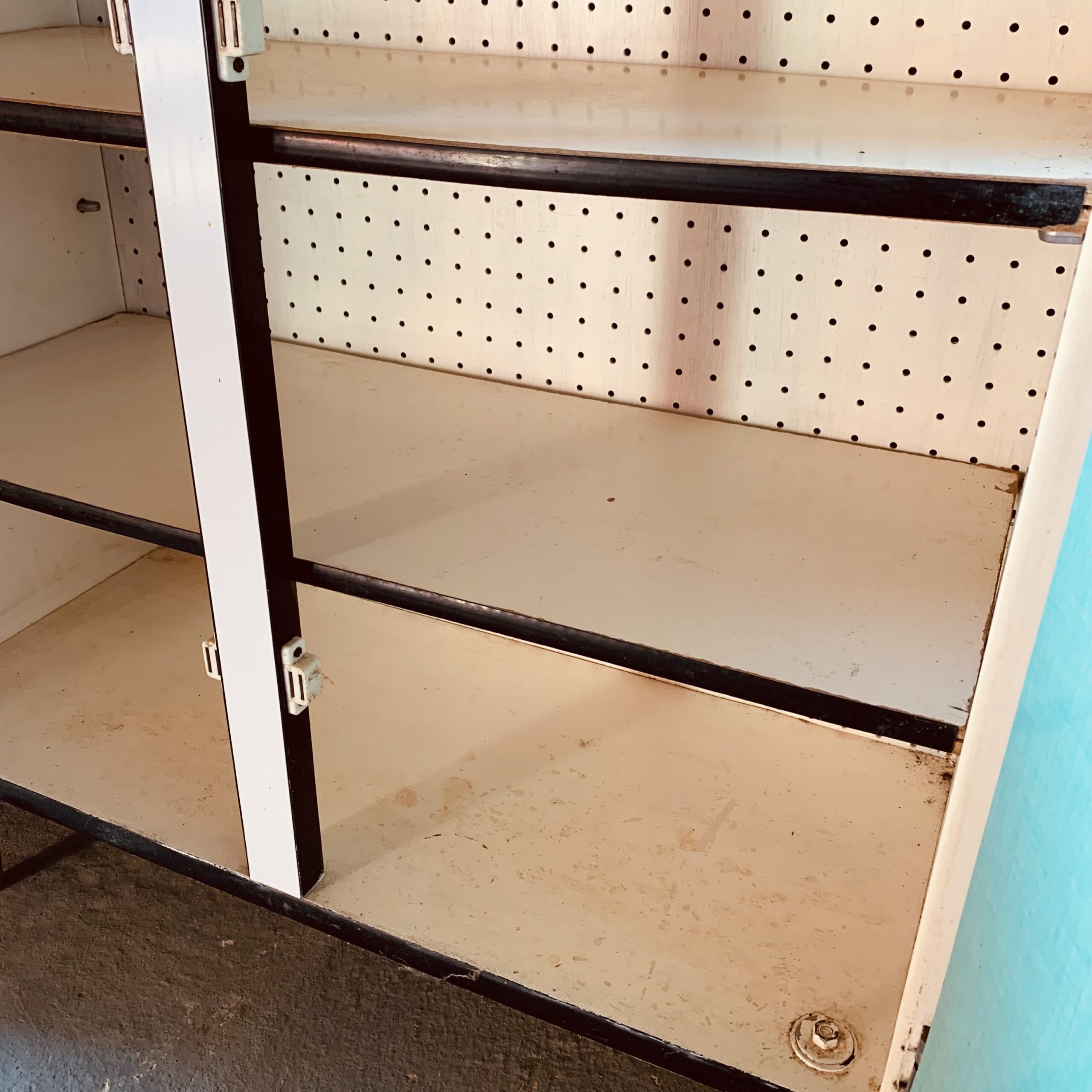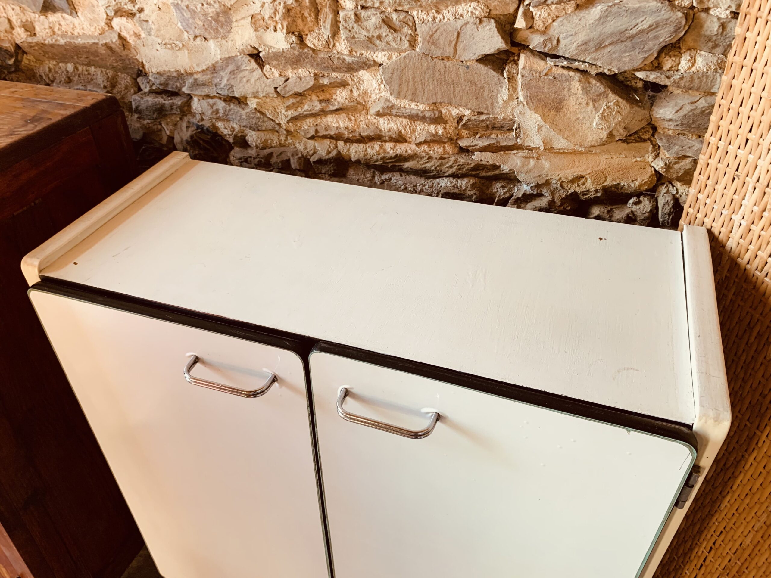 White kitchen sideboard on compass legs – Wood structure – cabinet with formica doors with white stickers on the outside – 3 floors – traces of time and use: stains, marks, scratches – vintage style – in good general condition –